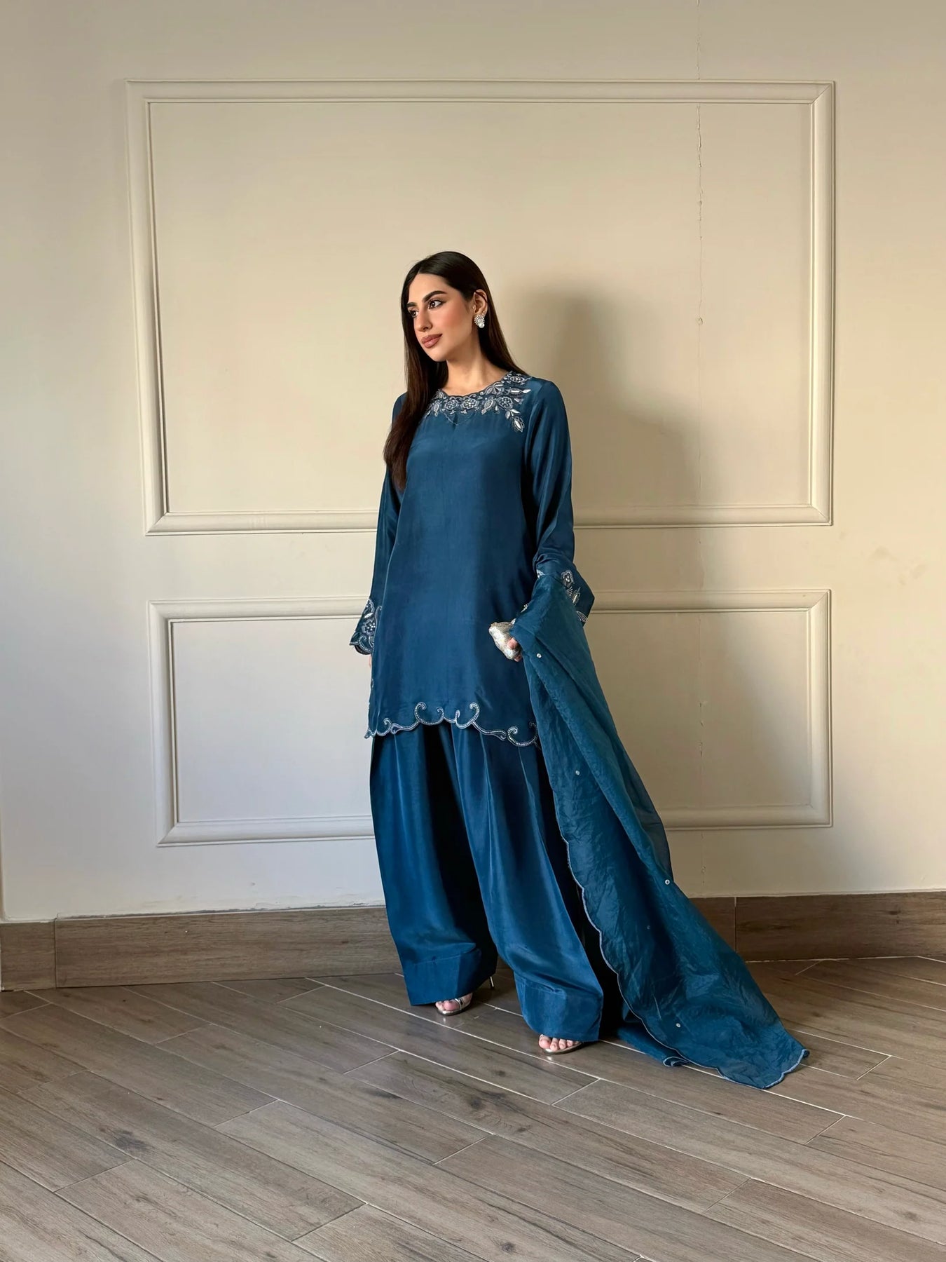 Azure is crafted in Pure Viscose with fine cut‑work detailing. Paired with a flowy farshi shalwar and a soft organza scalloped dupatta, this teal ensemble brings effortless festive elegance.