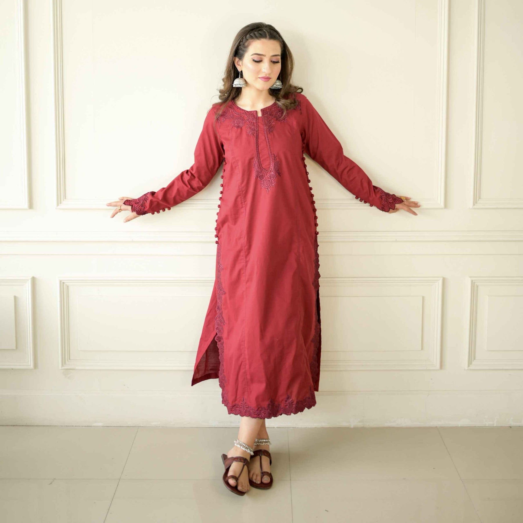 A paneled long shirt unfolds, decked in resplendent allure and graced by the presence of intricate floral embroidery elevate your ensemble, with culottes embroidered pants which embrace the profound beauty of nature, meticulously interwoven into every meticulously crafted stitch.