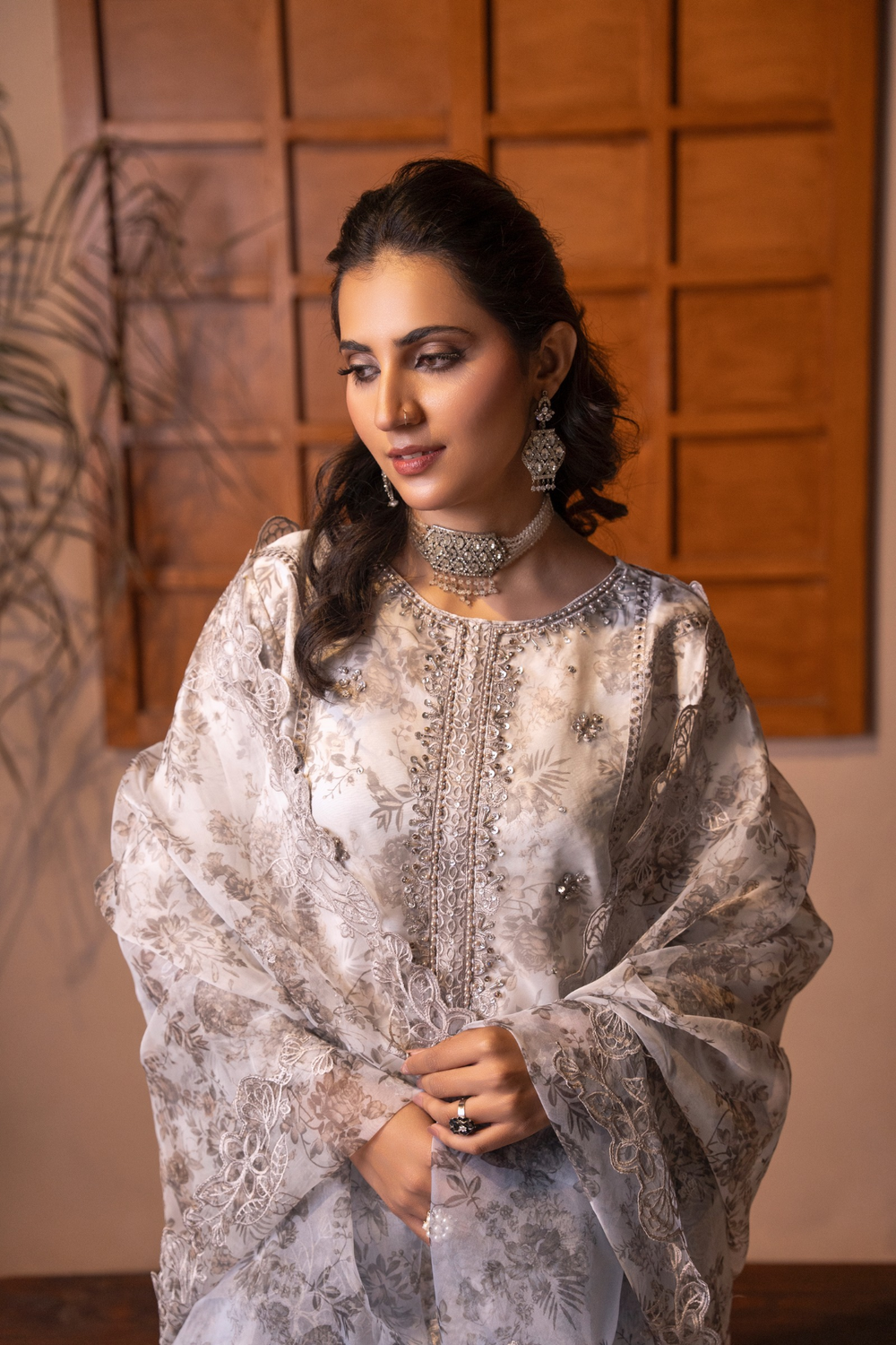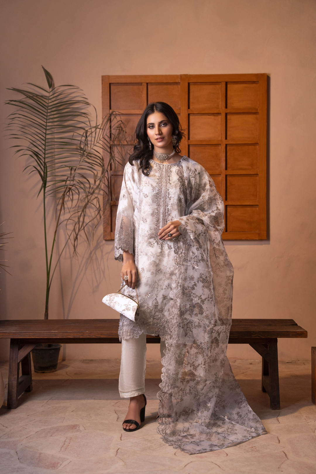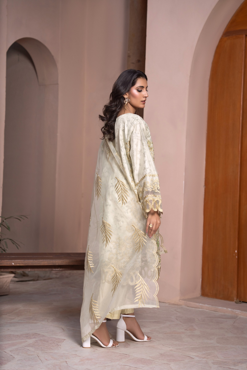 Qalamkar Off White Luxury Chikankari Embroidery Dress 3pc
